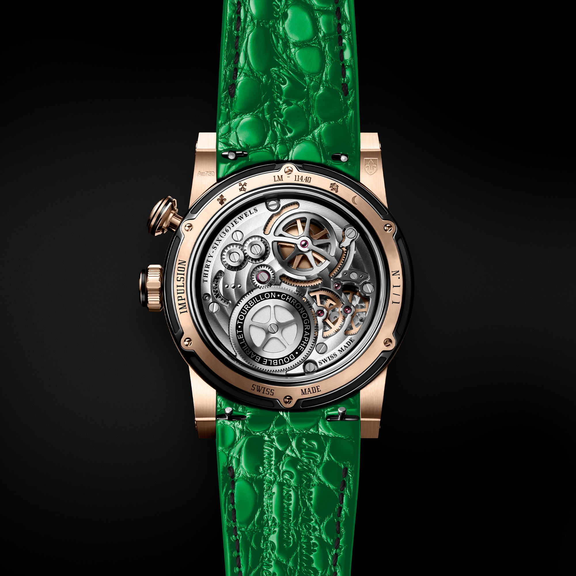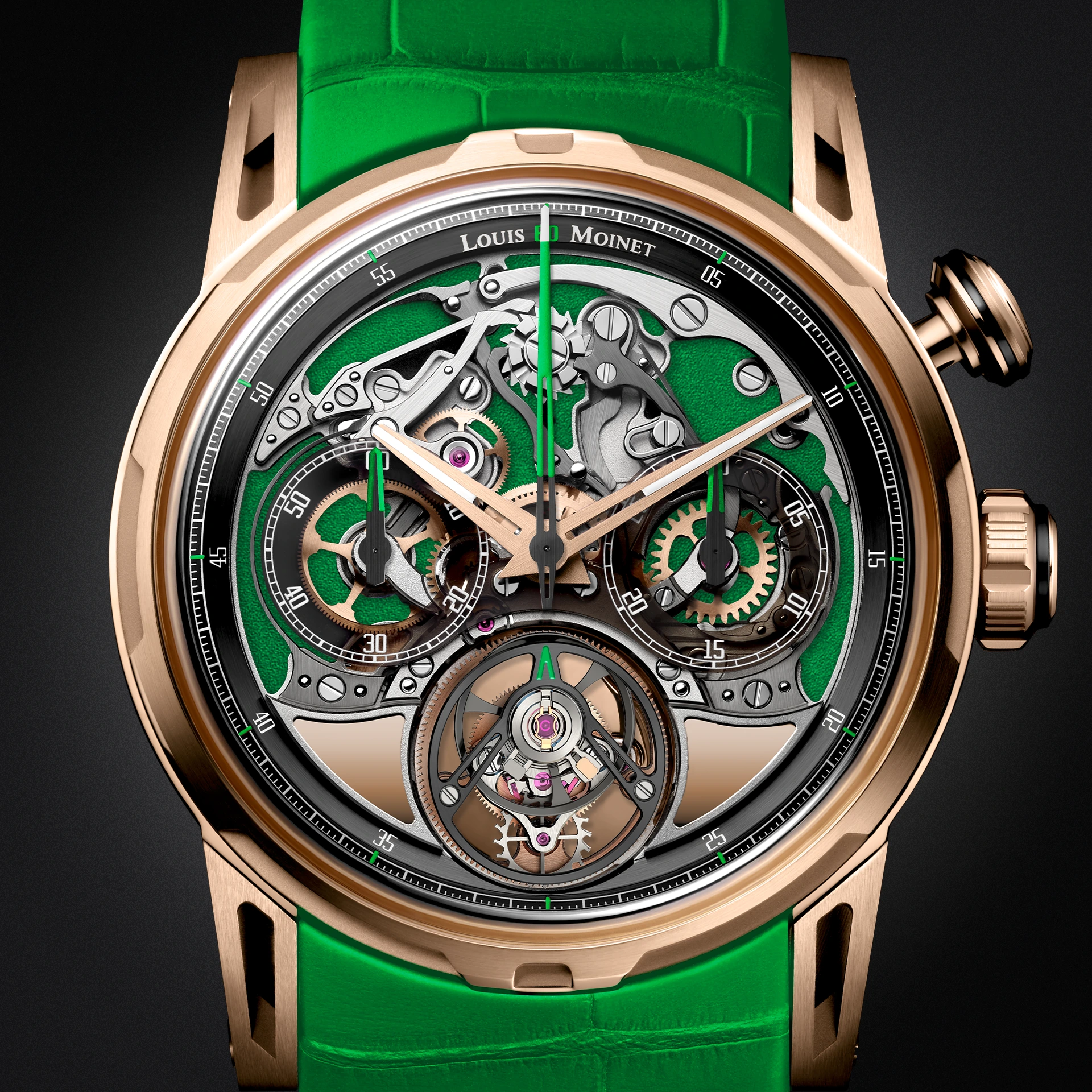 This IMPULSION RGB timepiece is powered by an in-house calibre, designed and assembled by Louis Moinet’s watchmakers in their workshops in Les Breuleux. At the heart of the chronograph, a column wheel precisely governs the start, stop, and reset functions, all controlled by a single push-button. This mechanical ballet is enhanced by the ethereal motion of the flying tourbillon, whose off-centre cage completes one rotation per minute.