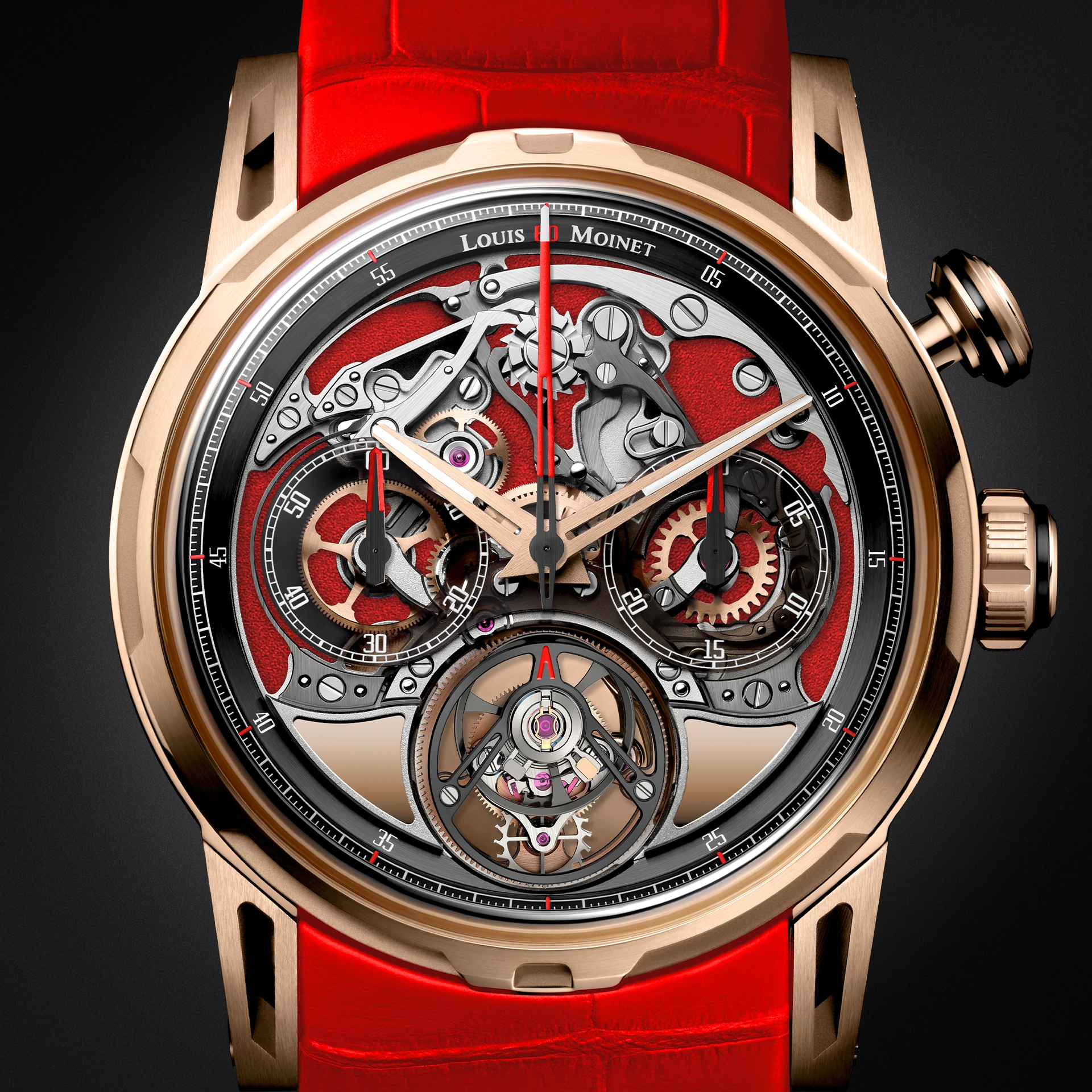 This IMPULSION RGB timepiece is powered by an in-house calibre, designed and assembled by Louis Moinet’s watchmakers in their workshops in Les Breuleux. At the heart of the chronograph, a column wheel precisely governs the start, stop, and reset functions, all controlled by a single push-button. This mechanical ballet is enhanced by the ethereal motion of the flying tourbillon, whose off-centre cage completes one rotation per minute.